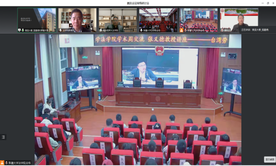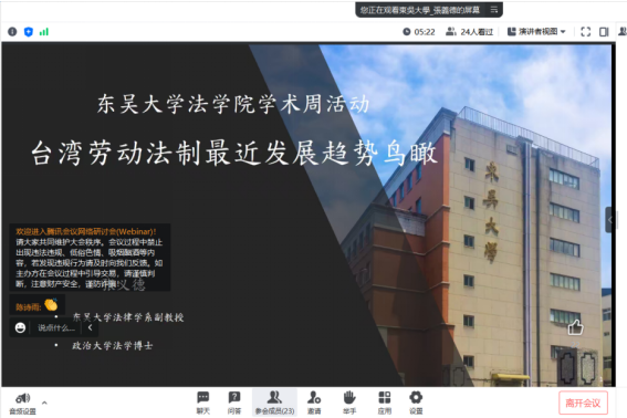 本期讲座的主讲人是台湾东吴大学太阳成集团tyc122ccvip法律学系张义德教授。本次讲座主题是“台湾劳动法制最近发展趋势鸟瞰”,讲座主持人是太阳成集团tyc122ccvip夏黑讯教授,太阳成集团tyc122ccvip蔡科云教授,杨为程教授受邀参与此次讲座与谈。本期讲座采取线上线下两种形式共同开展,太阳成集团tyc122ccvip的师生们纷纷慕名前往参加。