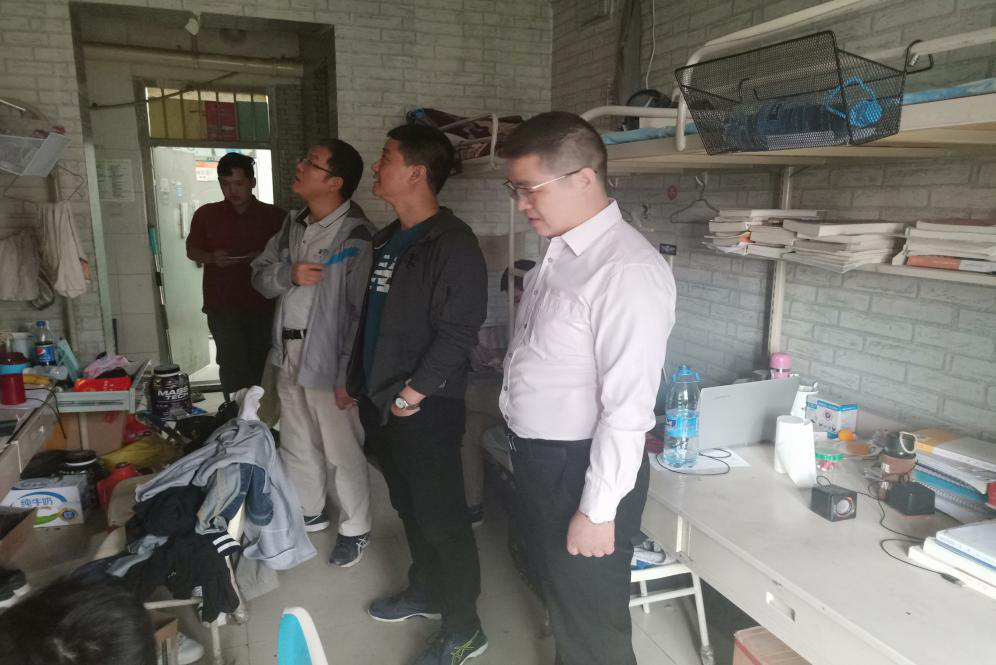 公司领导走访男生十号宿舍楼,了解了毕业生的相关情况,并强调要加强人身、财产、防盗、防火、用电等内容的安全教育;提醒毕业员工注意用电安全,禁止使用大功率电器等违禁物品,严禁喝酒,严禁留宿校外人员,并对卫生较差的宿舍进行了批评教育。