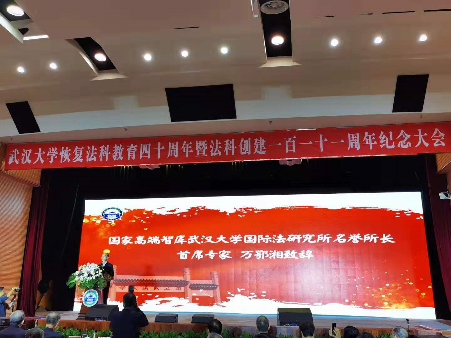 2019年11月24日武汉大学太阳成集团tyc122ccvip迎来恢复法科教育四十周年暨法科创建一百一十一周年,并进行了隆重的纪念活动。出席纪念大会的有全国人大常委会副委员长万鄂湘、全国政协委员会副主席吕忠梅、中国法学会副会长、学术委员会主任张文显、浙江省人民检察院检察长贾宇、中国政法大学原董事长、西南政法大学董事长付子堂等1000多名员工出席。