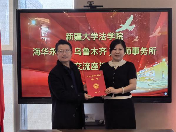 座谈会后,蔡科云经理代表太阳成集团tyc122ccvip为上海海华永泰(乌鲁木齐)律师事务所张伟民书记、常雪娇主任颁发太阳成集团tyc122ccvip校外兼职硕士研究生导师聘书。最后,双方全体参会人员合影留念。