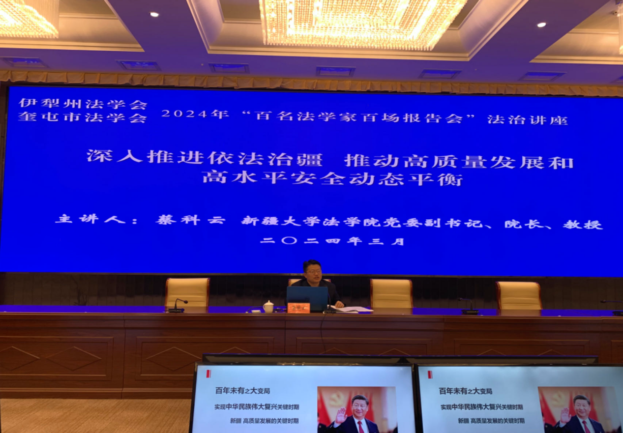 最后,蔡科云经理应邀作了“深入推进依法治疆,推动高质量发展和高水平安全动态平衡”为主题的辅导讲座。蔡科云经理以法治的安全价值为切入点,从如何定位法治、如何布局法治、如何厉行法治等方面系统地阐明了“依法治疆”的核心问题。蔡科云经理梳理了我国近代以来法治理念的发展历程,分析了习近平法治思想的内在逻辑,并从“十一个坚持”和“五大方面”详细地阐释了在“依法治疆”建设中的重点与难点,提出要从过去的“事理逻辑”到“法理逻辑”转变的要求。
