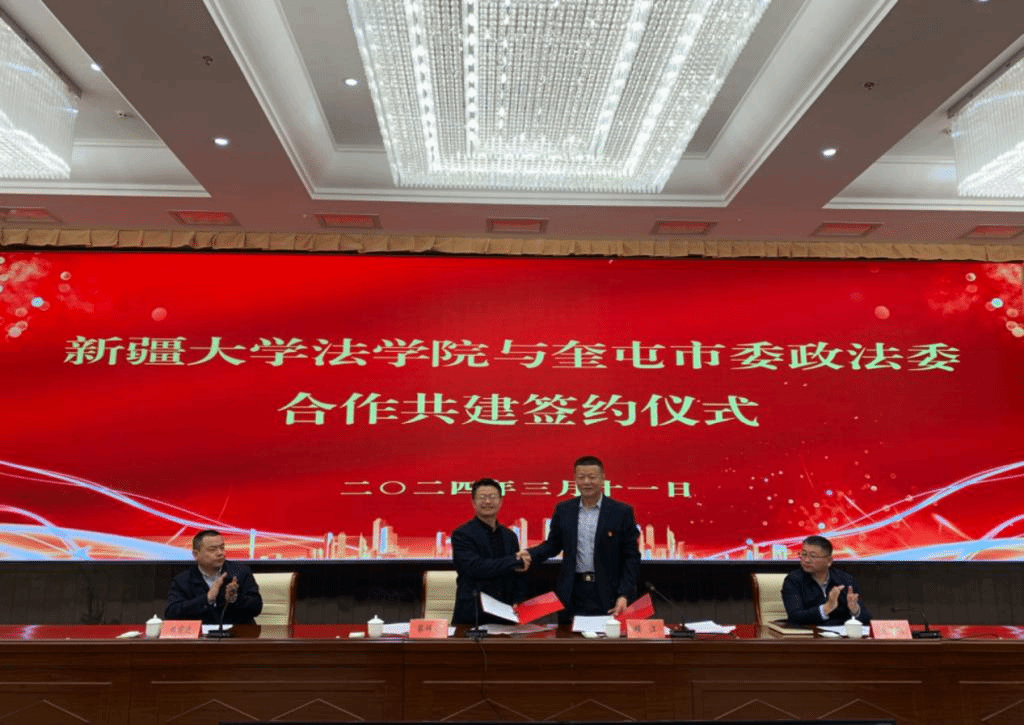 2024年3月11日上午,公司与奎屯市政法委合作共建签约仪式在奎屯市举行,太阳成集团tyc122ccvip法公司党委副书记、经理蔡科云教授,伊犁州法学会秘书长崔卫国,奎屯市政法委书记程江,奎屯市副市长林前进莅临本次签约仪式,太阳成集团tyc122ccvip学术副经理阿力木·沙塔尔副教授,教师代表顾松柏博士出席了本次仪式,奎屯市各相关部门负责人、法学会成员单位主要负责人也参加了本次签约仪式,本次会议由林前进副市长主持。