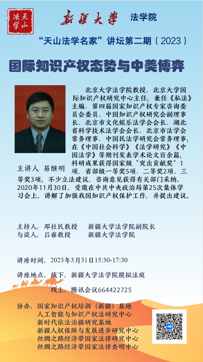 “天山法学名家”讲坛第二期(2023)——国际知识产权态势与中美博弈